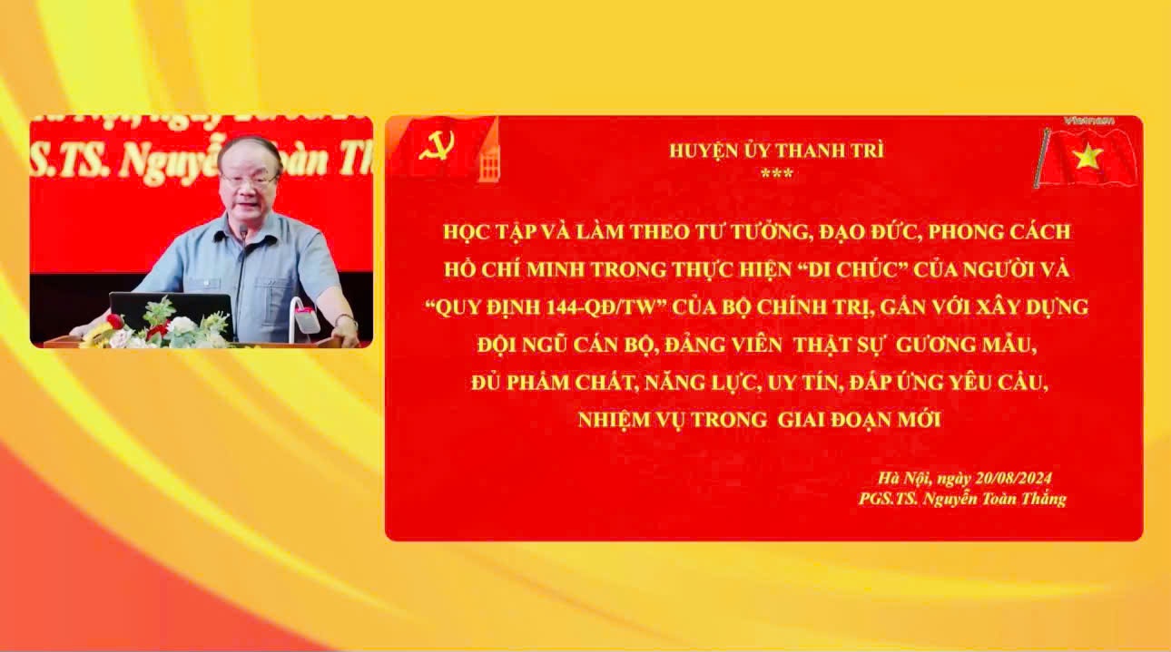 Kỷ niệm 55 năm thực hiện di chúc của Chủ tịch Hồ Chí Minh và 55 năm ngày mất của người (2/9/1969-2/9/2024); 79 năm Cách mạng tháng Tám và Quốc khánh (2/9); Sáng 20/8, Huyện ủy Thanh Trì tổ chức buổi sinh hoạt chính trị, học tập và làm theo tư tưởng, đạo đức, phong cách Hồ Chí Minh trong thực hiện Di chúc của Người và Quy định 144 – QĐ/TW của Bộ Chính trị gắn với xây dựng đội ngũ cán bộ, đảng viên thật sự gương mẫu, đủ phẩm chất, năng lực, uy tín, đáp ứng yêu cầu nhiệm vụ trong giai đoạn mới.