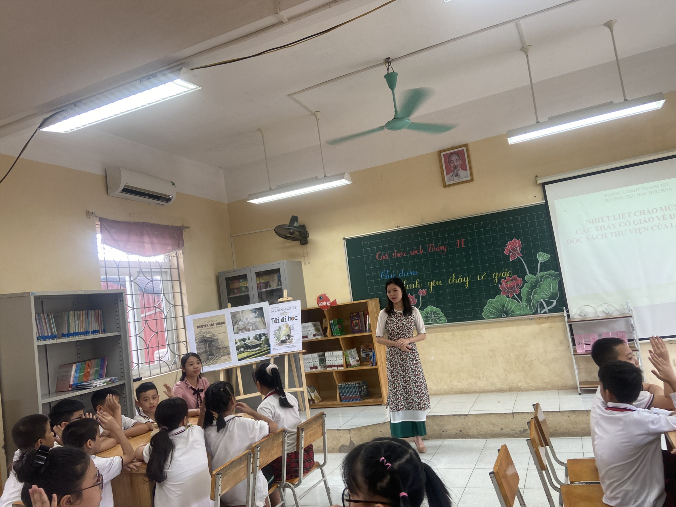 - Các con ạ, hình ảnh các thầy cô giáo được thể hiện thật chân thực và xúc động qua những cuốn sách, cuốn truyện. Sau đây xin mời cô Ánh giới thiệu với các con khu trưng bày sách truyện của Thư viện Nhà trường theo chủ điểm tháng 11: Kính yêu thầy cô giáo.