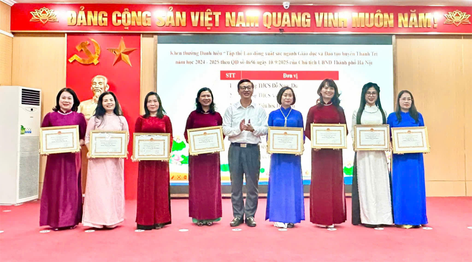 Cô Nguyễn Thúy Thanh – Bí thư Chi bộ, Hiệu trưởng nhà trường (áo dài nhung đỏ từ phải qua) đại diện nhà trường nhận Danh hiệu “Tập thể Lao động xuất sắc ngành Giáo dục và Đào tạo huyện Thanh Trì năm học 2024 – 2025”.