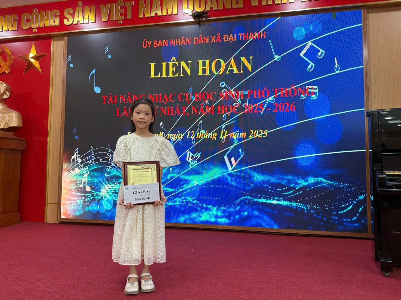 Tại chương trình, em Lê Phương Tuệ Anh – học sinh lớp 4A1, Trường Tiểu học Hữu Hòa đã mang đến phần trình diễn Piano đầy cảm xúc. Dưới những ngón tay nhỏ nhắn nhưng tự tin, từng phím đàn vang lên trong trẻo, nhẹ nhàng mà sâu lắng. Màn biểu diễn của em không chỉ chinh phục khán giả và Ban giám khảo mà còn thể hiện rõ niềm say mê và tâm hồn nghệ sĩ của một cô học trò yêu âm nhạc. Với phần thể hiện ấn tượng ấy, Tuệ Anh đã xuất sắc giành Giải Bạc – phần thưởng xứng đáng cho nỗ lực và đam mê mà em đã bền bỉ theo đuổi.