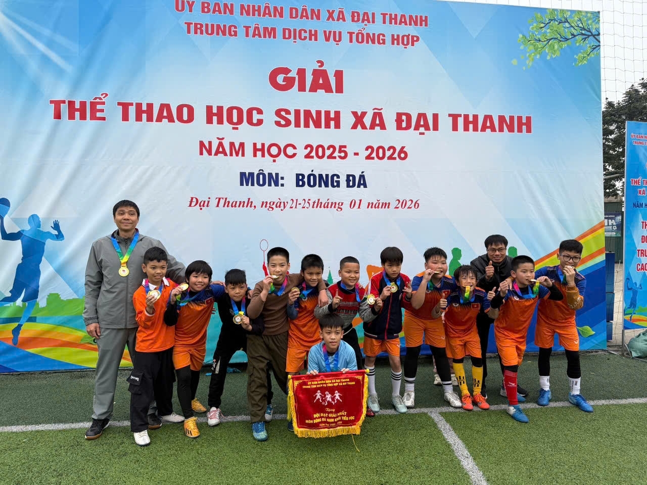 Đội bóng trường Tiểu học Hữu Hòa nhận Huy chương Vàng từ Ban tổ chức.