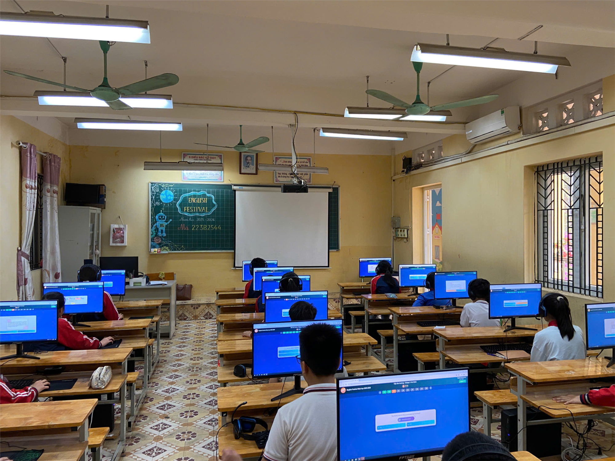 Các em học sinh làm bài trực tiếp trên máy tính với bộ đề do Trung tâm Ngoại ngữ Đăng Khoa xây dựng.