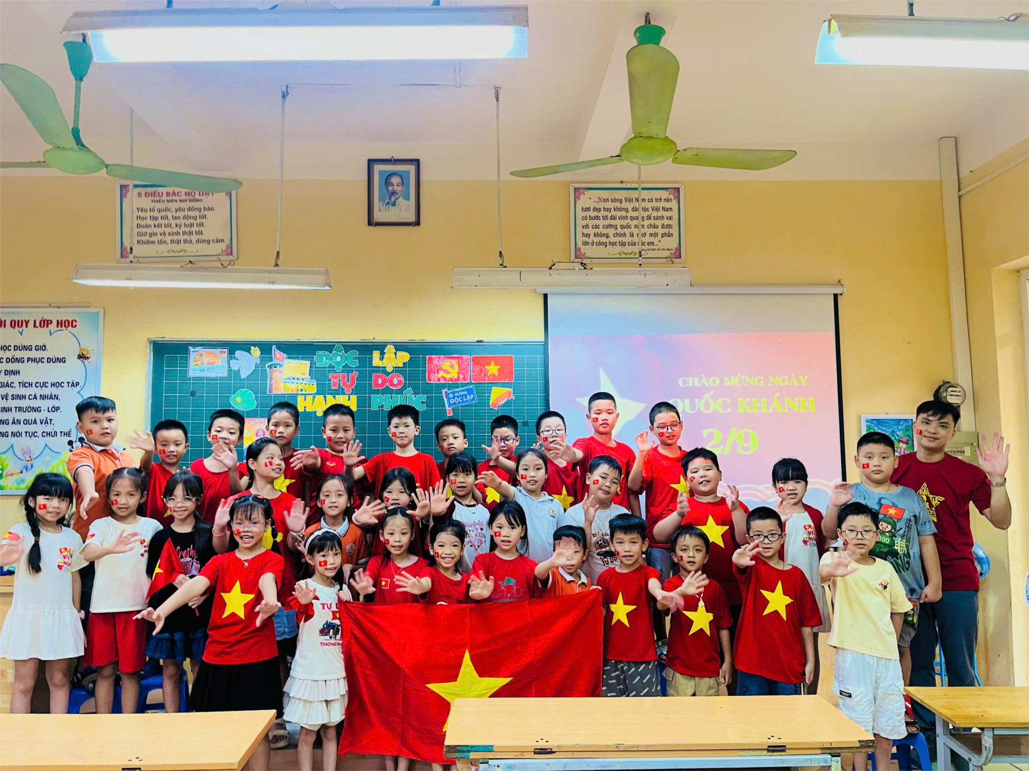 Dưới đây là những hình ảnh rực rỡ cờ hoa, sắc cờ đỏ sao vàng phủ khắp lớp học và sân trường, thể hiện tinh thần yêu nước và niềm tự hào dân tộc của thầy trò Trường Tiểu học Hữu Hòa trong dịp Quốc khánh 2/9.