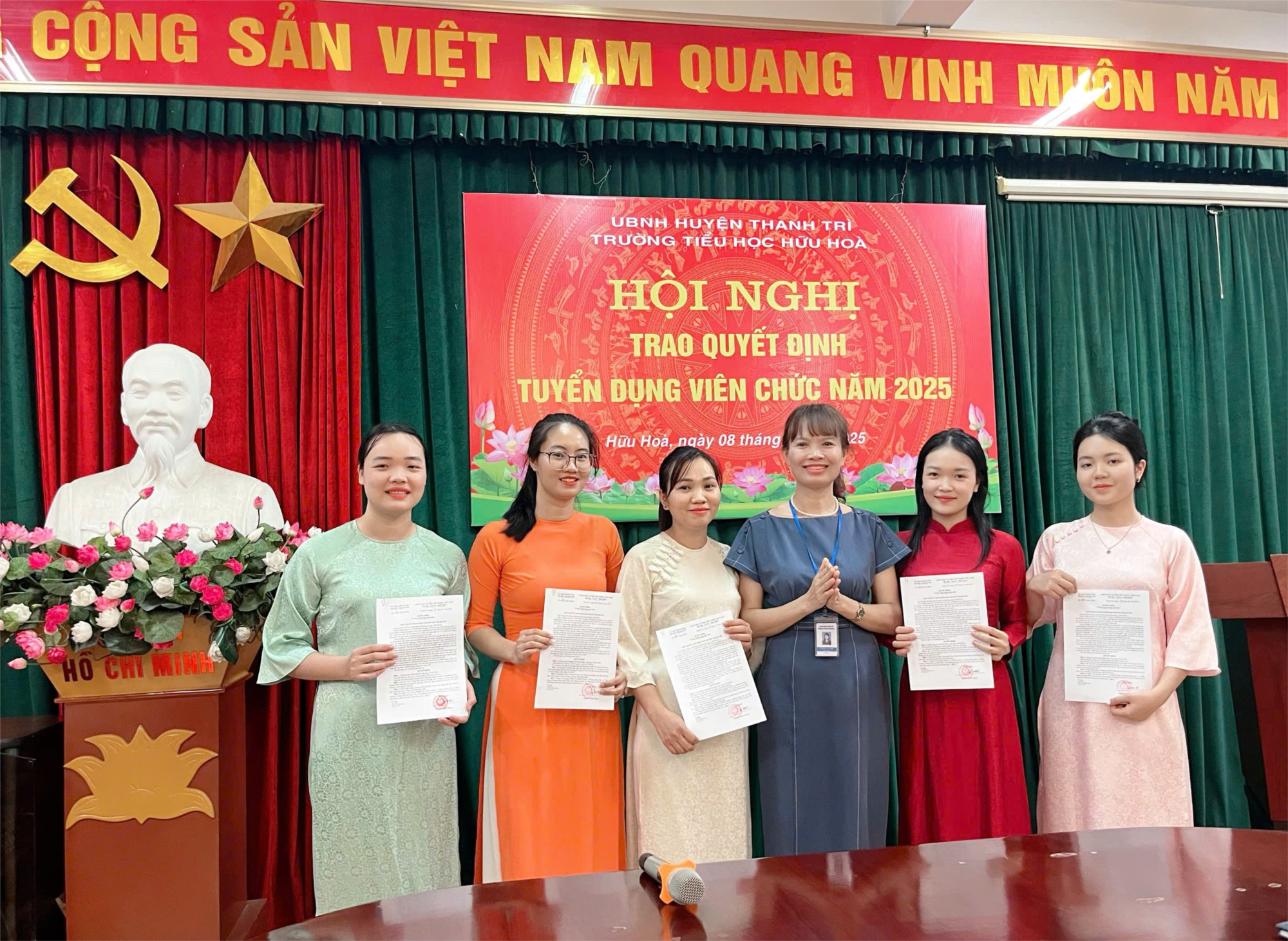 5 đồng chí giáo viên viên chức mới của trường Tiểu học Hữu Hòa: đ/c Đào Hạ Vi (áo dài xanh), đ/c Nguyễn Thị Minh Ngọc (áo dài cam), đ/c Nguyễn Thị Nga (áo dài kem), đ/c Lưu Trà My (áo dài đỏ), đ/c Trần Kim Chi (áo dài hồng)