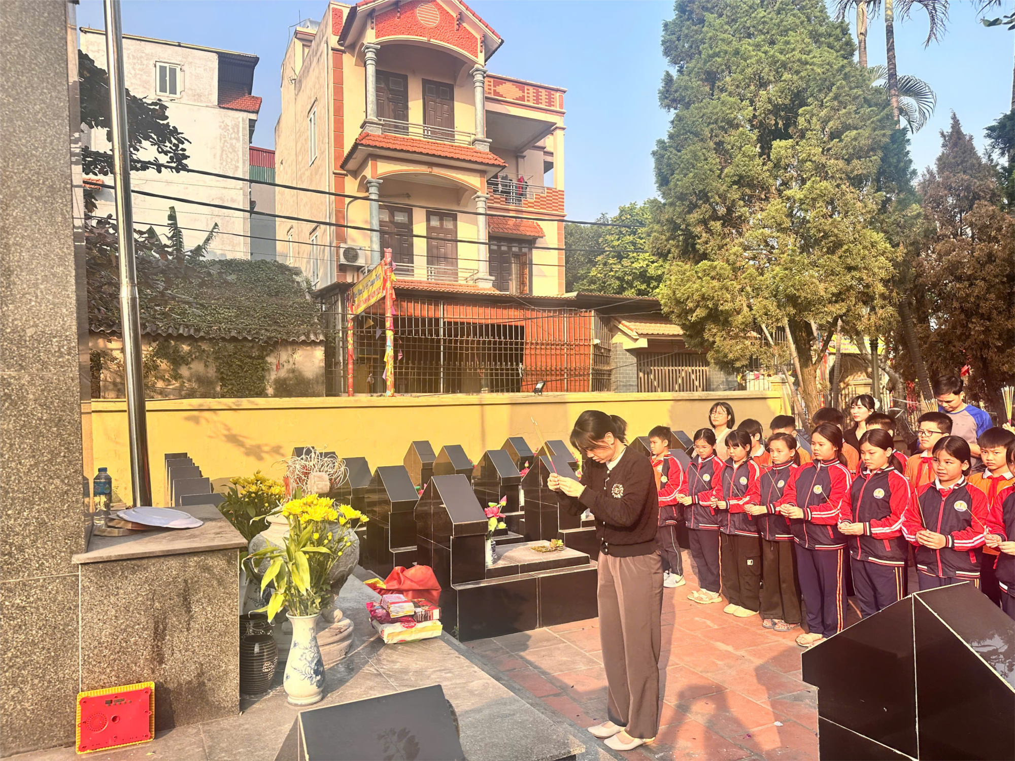 Theo sự hướng dẫn của cô giáo Đàm Thị Minh Tuyền, các em đã trang nghiêm dành một phút mặc niệm tưởng nhớ công lao của các anh hùng liệt sĩ - những người con ưu tú của dân tộc đã hy sinh vì độc lập, tự do của đất nước. Cầm trên tay những nén hương thơm, các thầy cô cùng các em học sinh đã chia nhau đến thắp hương trên từng ngôi mộ. Đó là nén tâm hương tưởng nhớ và tri ân các anh hùng liệt sĩ.