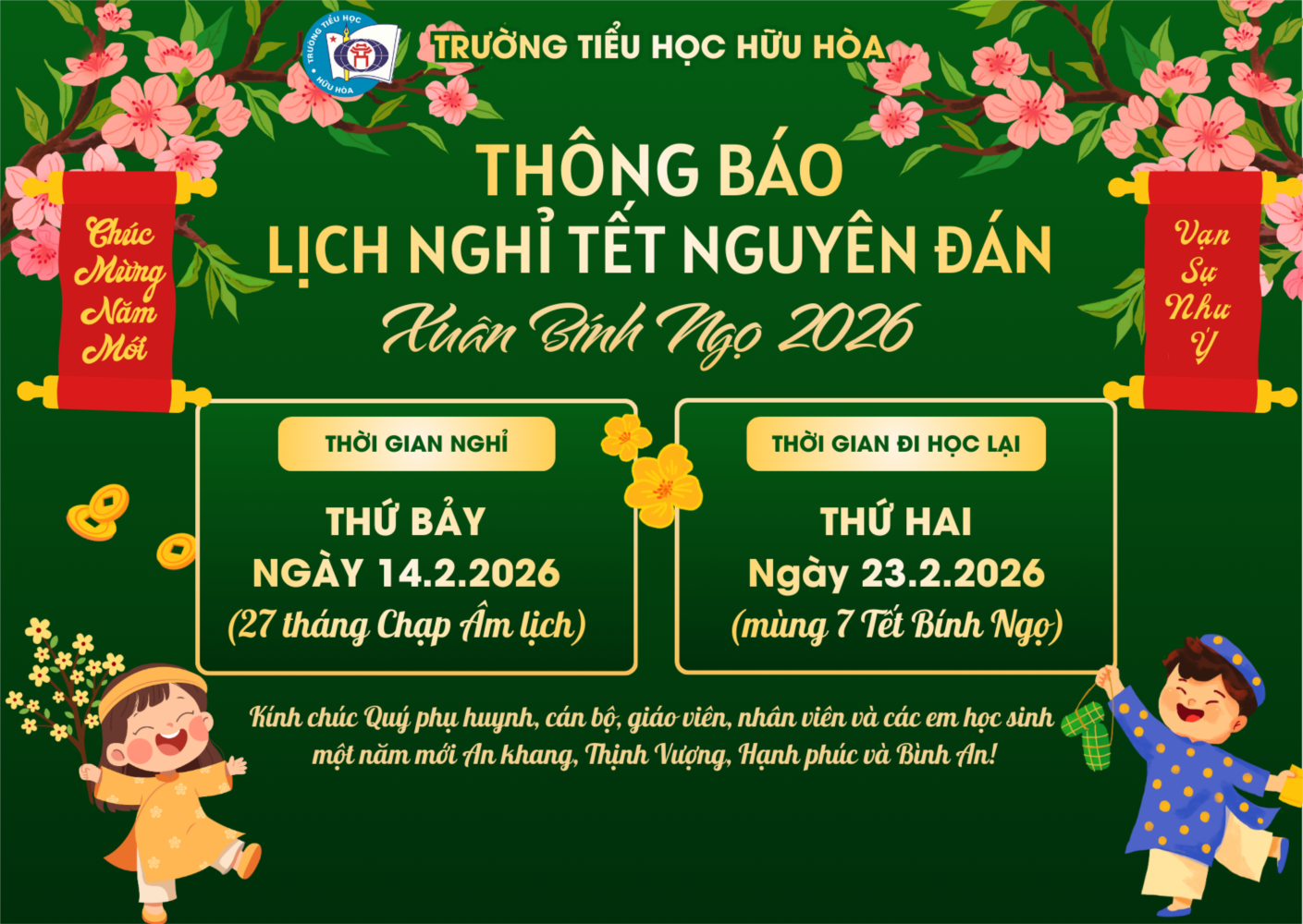 📌 Trường Tiểu học Hữu Hòa xin thông báo lịch nghỉ Tết Nguyên Đán năm 2026 cụ thể như sau: