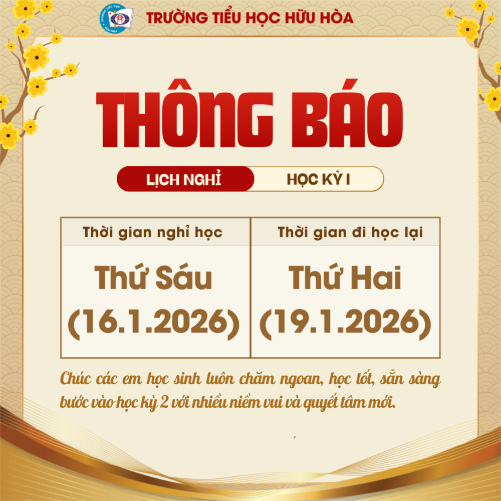 Sau một học kì học tập và rèn luyện chăm chỉ, các em học sinh đã có nhiều cố gắng, nỗ lực và tiến bộ. Nhà trường mong rằng trong ngày nghỉ này, các em sẽ có thời gian nghỉ ngơi, vui chơi lành mạnh bên gia đình, giữ gìn sức khỏe, chuẩn bị tinh thần thật tốt để bước vào học kì tiếp theo với nhiều niềm vui và quyết tâm mới.