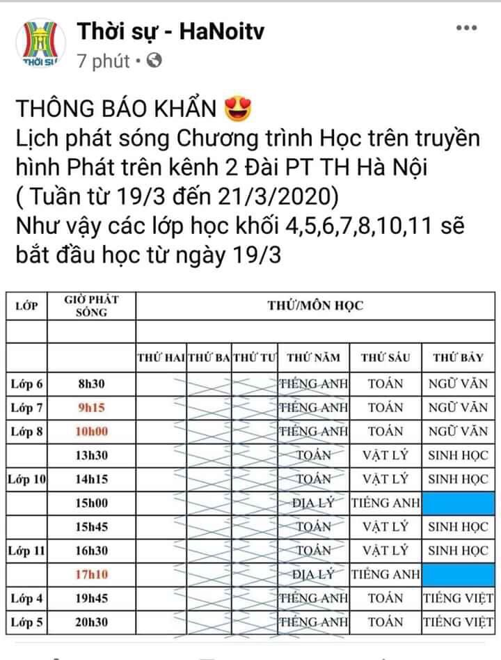 Lịch phát sóng Chương trình Học trên truyền hình Phát trên kênh 2 Đài PT - TH Hà Nội ( tuần từ 19/3 /2020 đến 23/3/2020). Như vậy các lớp học khối 4,5,6,7,8,10,11 sẽ bắt đầu học từ ngày 19/3/2020.