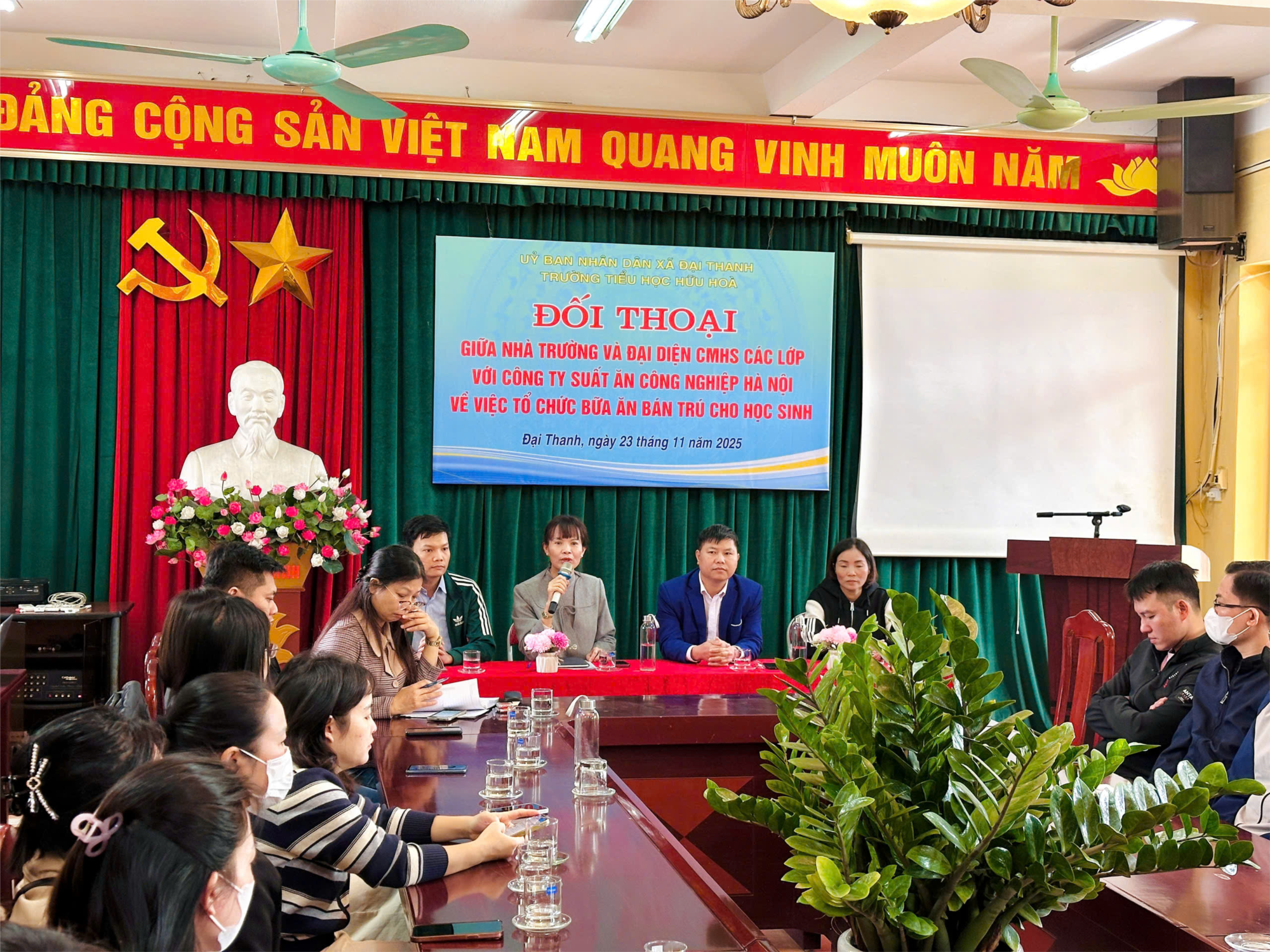 Sáng Chủ nhật (23/11), Trường Tiểu học Hữu Hòa đã tổ chức Hội nghị Đối thoại giữa nhà trường và Đại diện cha mẹ học sinh các lớp với Công ty CP Suất ăn Công nghiệp Hà Nội nhằm trao đổi, thống nhất và nâng cao chất lượng bữa ăn bán trú cho học sinh trong năm học 2025–2026. Đây là hoạt động có ý nghĩa thiết thực, thể hiện sự quan tâm sâu sắc của các bậc phụ huynh và sự chủ động phối hợp của nhà trường trong công tác chăm sóc, nuôi dưỡng học sinh. Hội nghị được tổ chức theo đề xuất của Ban đại diện cha mẹ học sinh với mong muốn tạo cơ hội gặp gỡ, trao đổi trực tiếp giữa phụ huynh và đơn vị cung cấp suất ăn, qua đó các bên cùng chia sẻ những mong muốn, giải đáp các băn khoăn, bổ sung thông tin về quy trình tổ chức bữa ăn, công tác đảm bảo vệ sinh an toàn thực phẩm, khẩu phần dinh dưỡng, chất lượng chế biến, cũng như việc phối hợp chăm sóc học sinh trong giờ ăn – ngủ bán trú, hướng tới mục tiêu nâng cao chất lượng bữa ăn và tăng cường sự đồng hành, tin tưởng giữa gia đình và nhà trường.